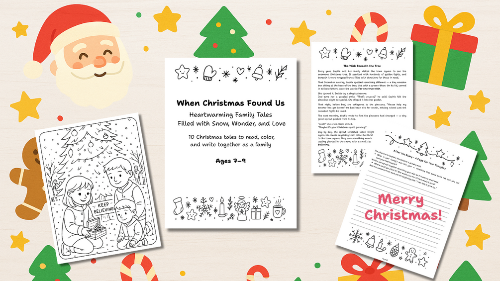 When Christmas Found Us – Reflect & Write (Ages 7–9) 10 gentle Christmas stories with reflective writing prompts for children and families to enjoy together. A cozy printable to support emotional expression, mindful writing, and holiday connection. PDF – 39 pages – Ages 7–9.
