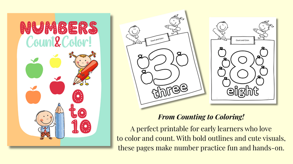 Numbers – Count & Color! (Ages 3–5) A 16-page printable pack to help little learners count from 0 to 10 by matching and coloring cute apple illustrations. Perfect for early math practice through play. PDF – US Letter