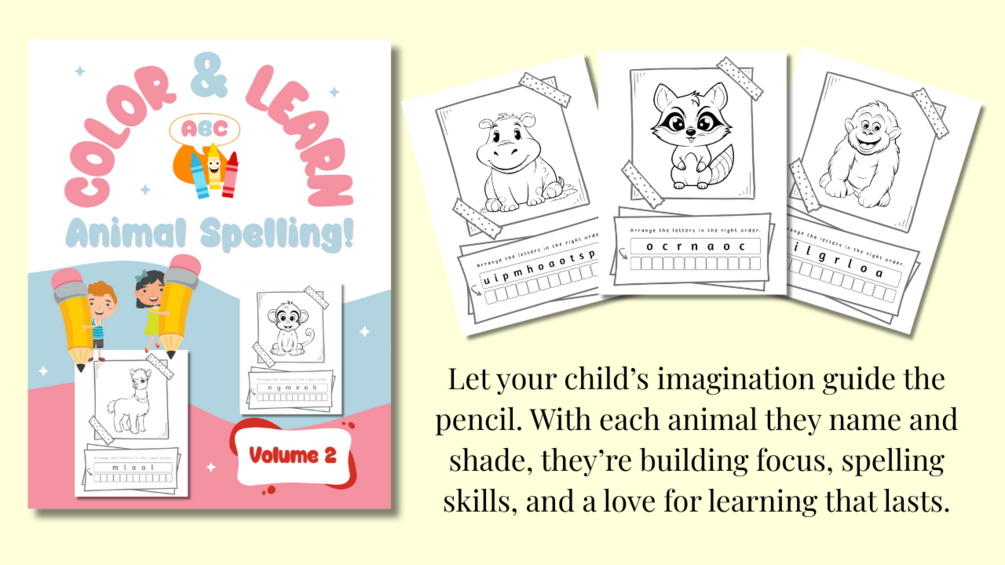 Color & Learn – Animal Spelling! (Volume 2) (Ages 5–8) A 24-page printable pack with 19 new animal names to unscramble and color — perfect for strengthening spelling and word recognition through fun, creative play. PDF – US Letter