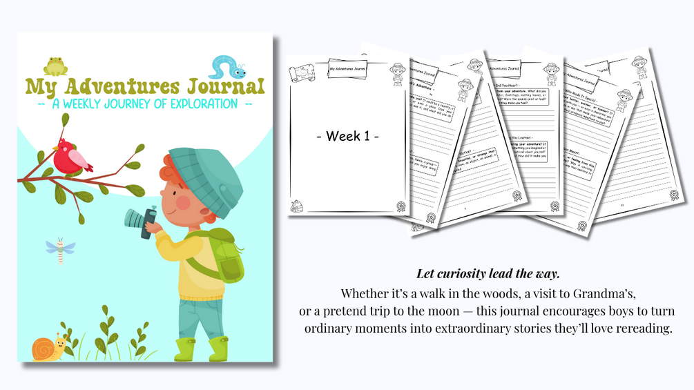 Each week includes creative prompts to help boys reflect on what they did, how they felt, what surprised them, and what they want to remember — whether they’re exploring the backyard or inventing their world.
