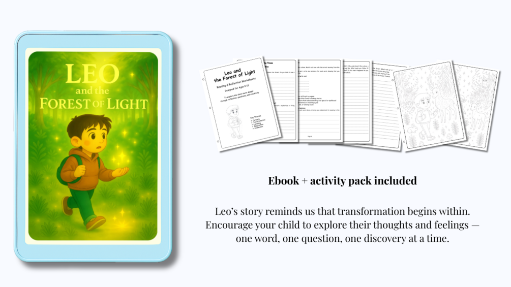 Leo and the Forest of Light – Story & Activity Bundle (Ages 9–12) A quiet, poetic story paired with a 72-page printable activity pack. Includes guided questions, writing prompts, and creative pages to support reading comprehension and personal reflection. PDF – eBook + Worksheets